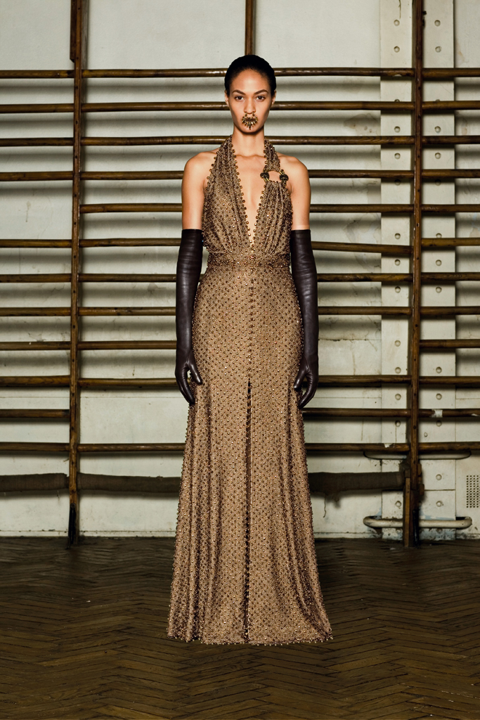 Total - white no more. Finalmente tornano sfumature e influenze 'dark' nell'alta moda di Riccardo Tisci. Avendo costruito uno stile solido basato sulla confluenza di richiami gotici, romantici e trasgressivi nei suoi primi anni a Givenchy, ultimamente Tisci si è discostato da ciò che l'aveva reso famoso, con discutibili esperimenti nel ready to wear ed eliminando le sfilate dell'haute couture, votandosi a collezioni solide ma 'limitate' ad (incredibili, ma forse ripetitivi) abiti bianchi (o dorati, beige, di tonalità eteree). FINALMENTE torna il nero. Non tutti i look sono memorabili, ma è qualcosa di nuovo, diverso, e allo stesso tempo un ritorno alle sue 'origini'.